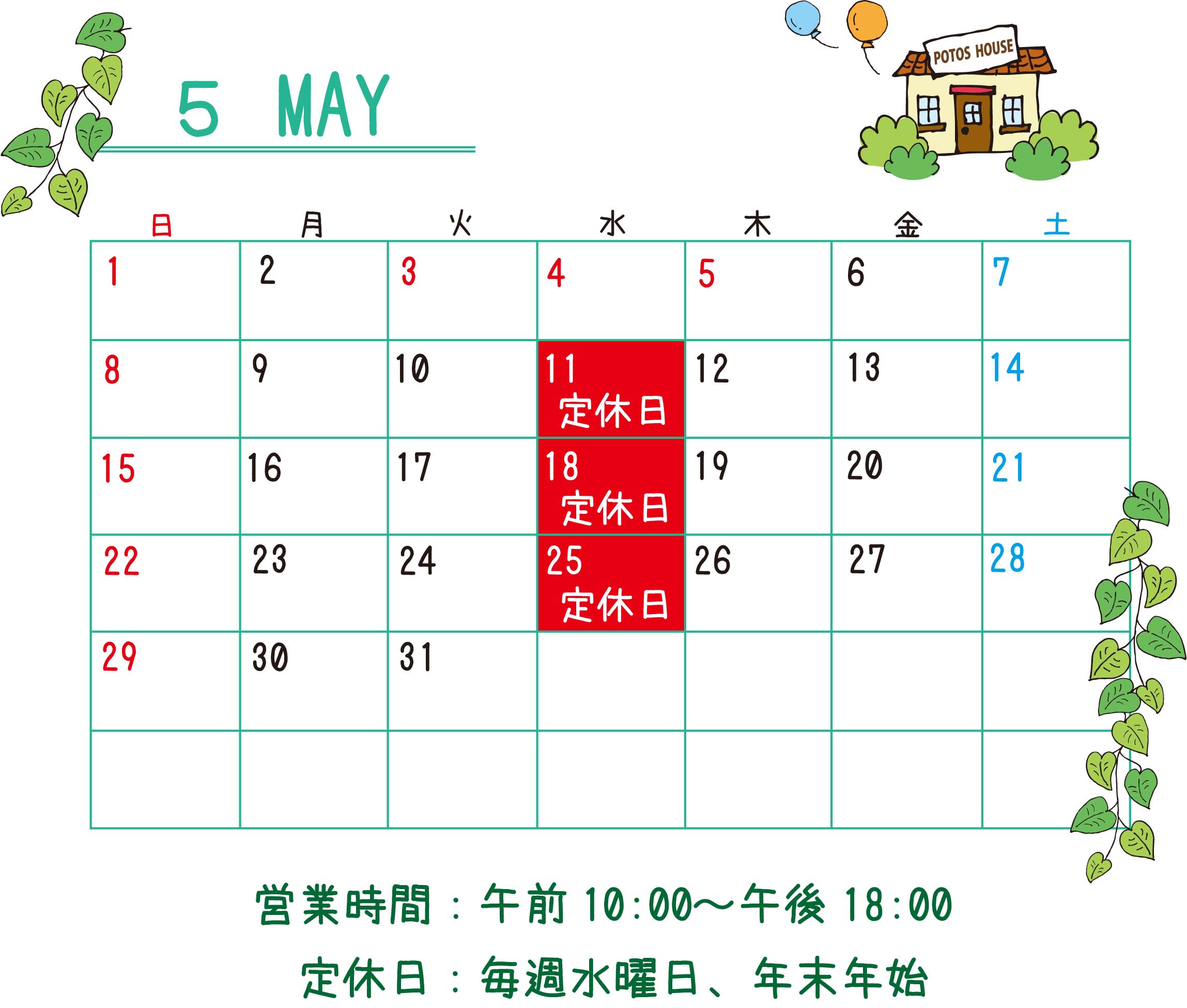 さて、POTOS HOUSEの5月営業予定はこちらです。