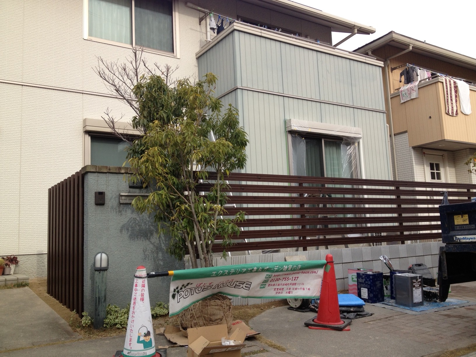 淡いブルーの外壁一部と門柱ですが、先に施工した木調のフェンス類に合わせて、