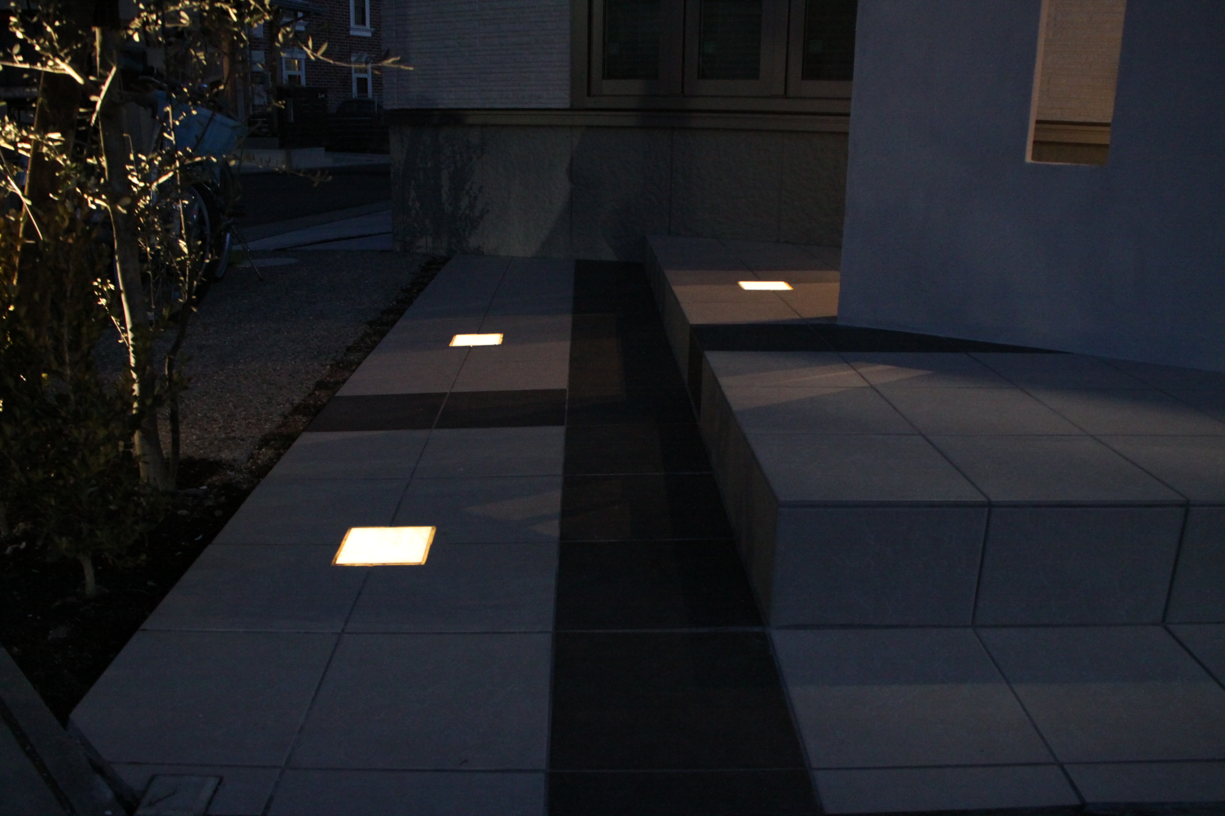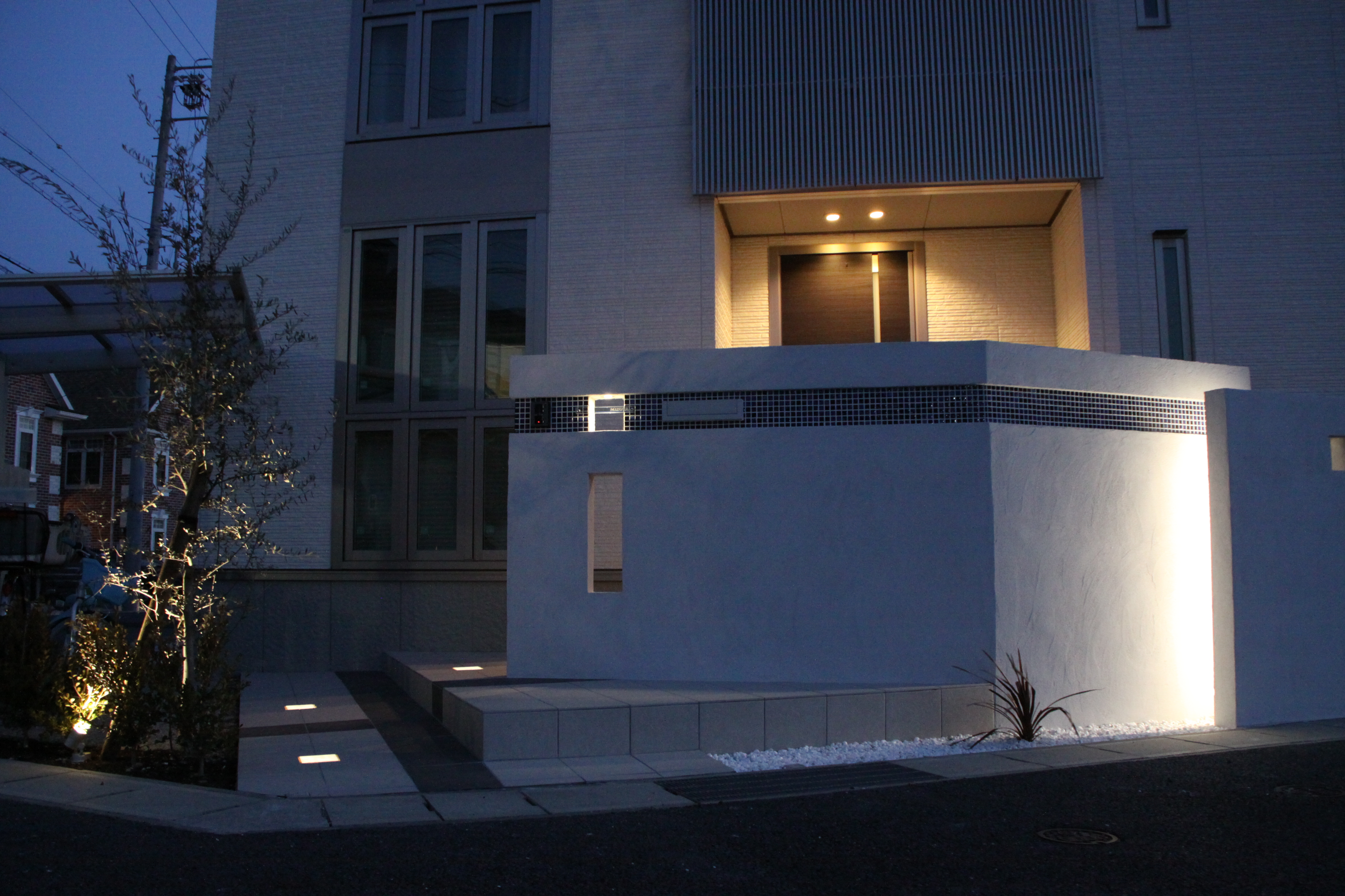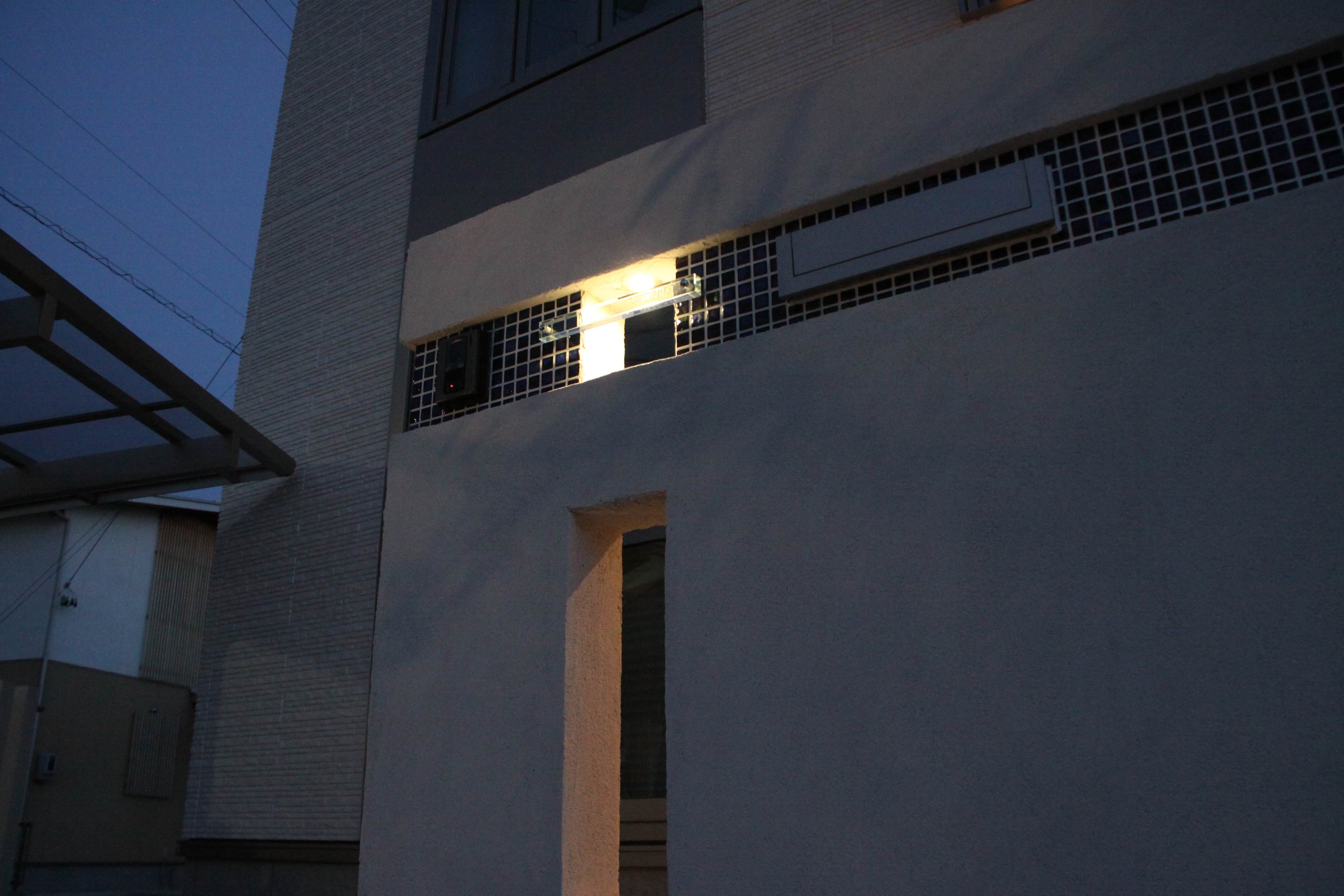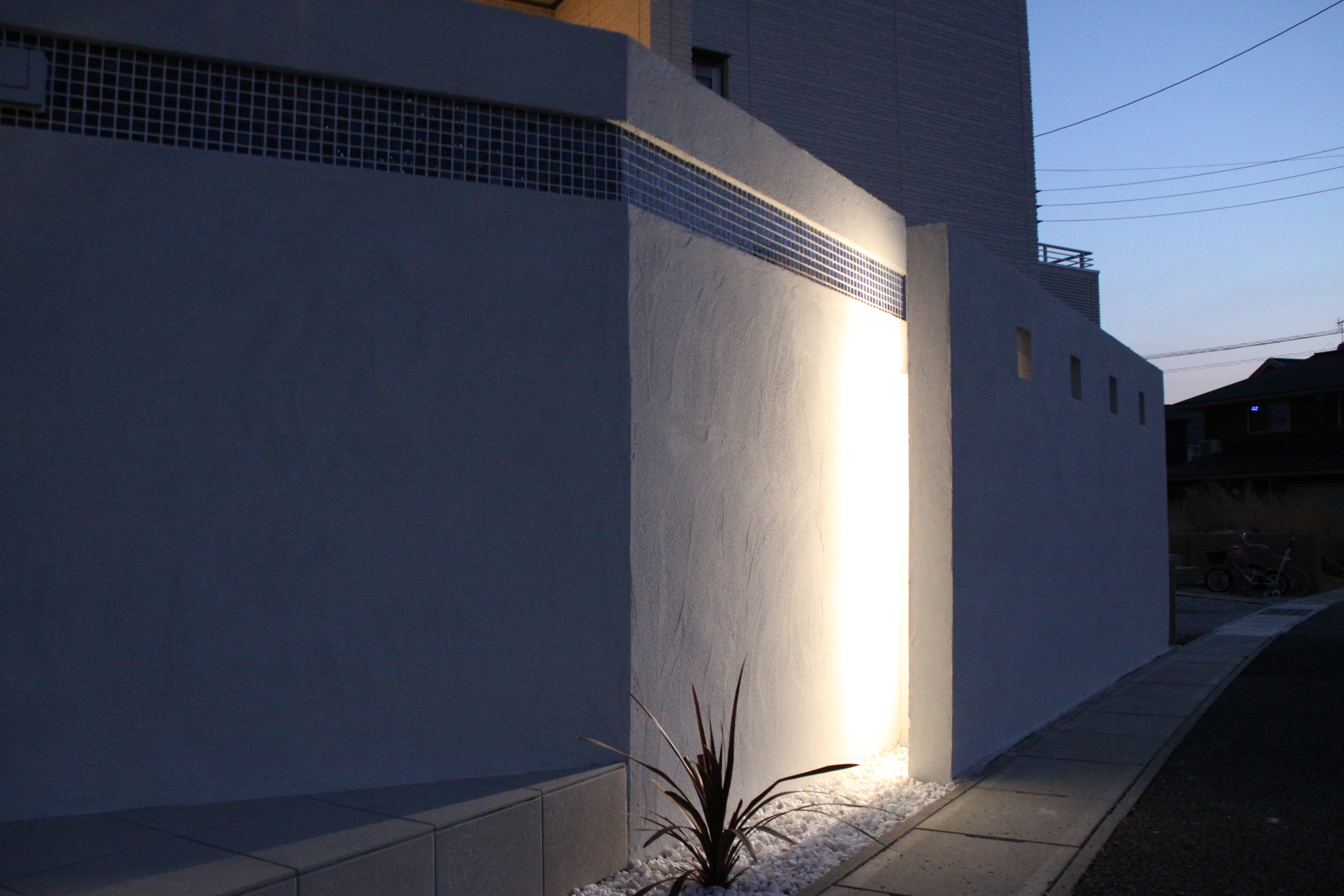 オフセットさせた壁に夜間奥行き感を出させるためにこのような照明器具が入れてあります。
