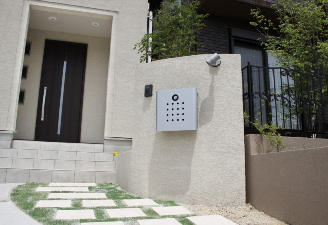 シンプルなステン系表札・ポスト・ライトが、きりりと場を引き締めます。
