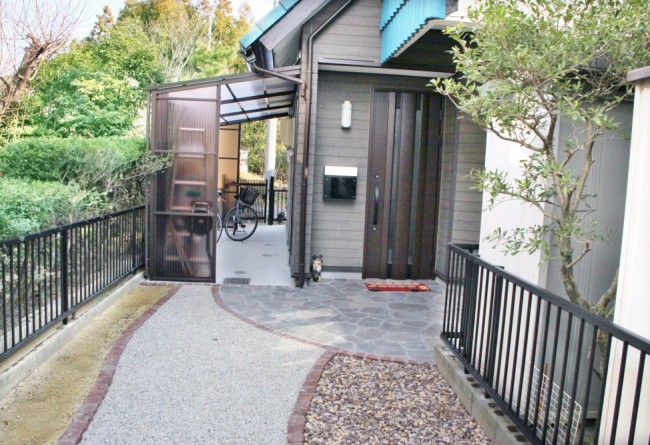 玄関まで続くアプローチは茶色とグレーで統一されていて落ち着いた雰囲気を演出します。