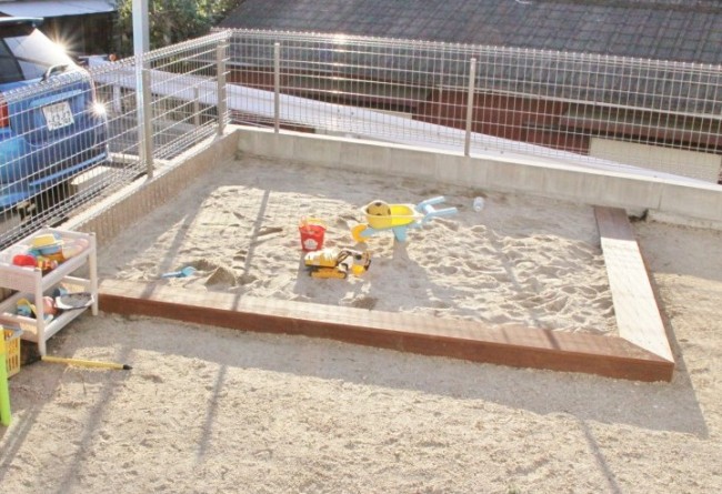 ウリン材で砂場を施工させて頂きました。お子さんが大きくなったら、花壇としてお使いいただけます。
