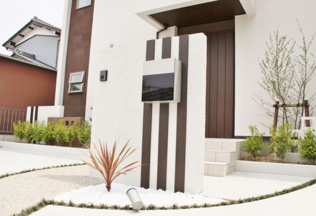 住宅とも色を合わせた門柱は、夜にはニューサイランがライトアップされて大人な雰囲気に。