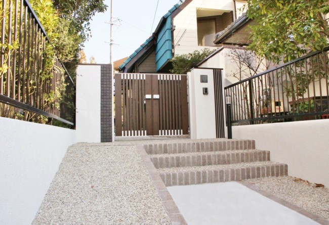 玄関まで続くアプローチは茶色とグレーで統一されていて落ち着いた雰囲気を演出します。